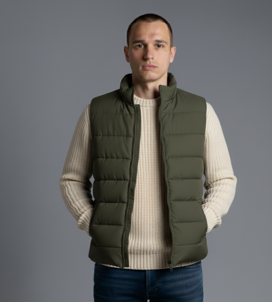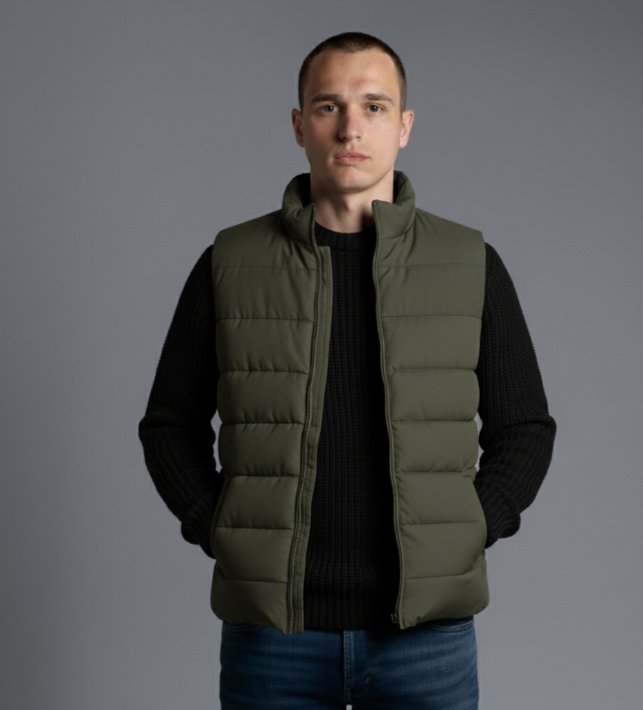 پافر مردانه سبز لاین لوکس دارای دو جیب در جلو است. پافر با وجود داشتن استر پشم شیشه گرما کافی را فراهممیکند.