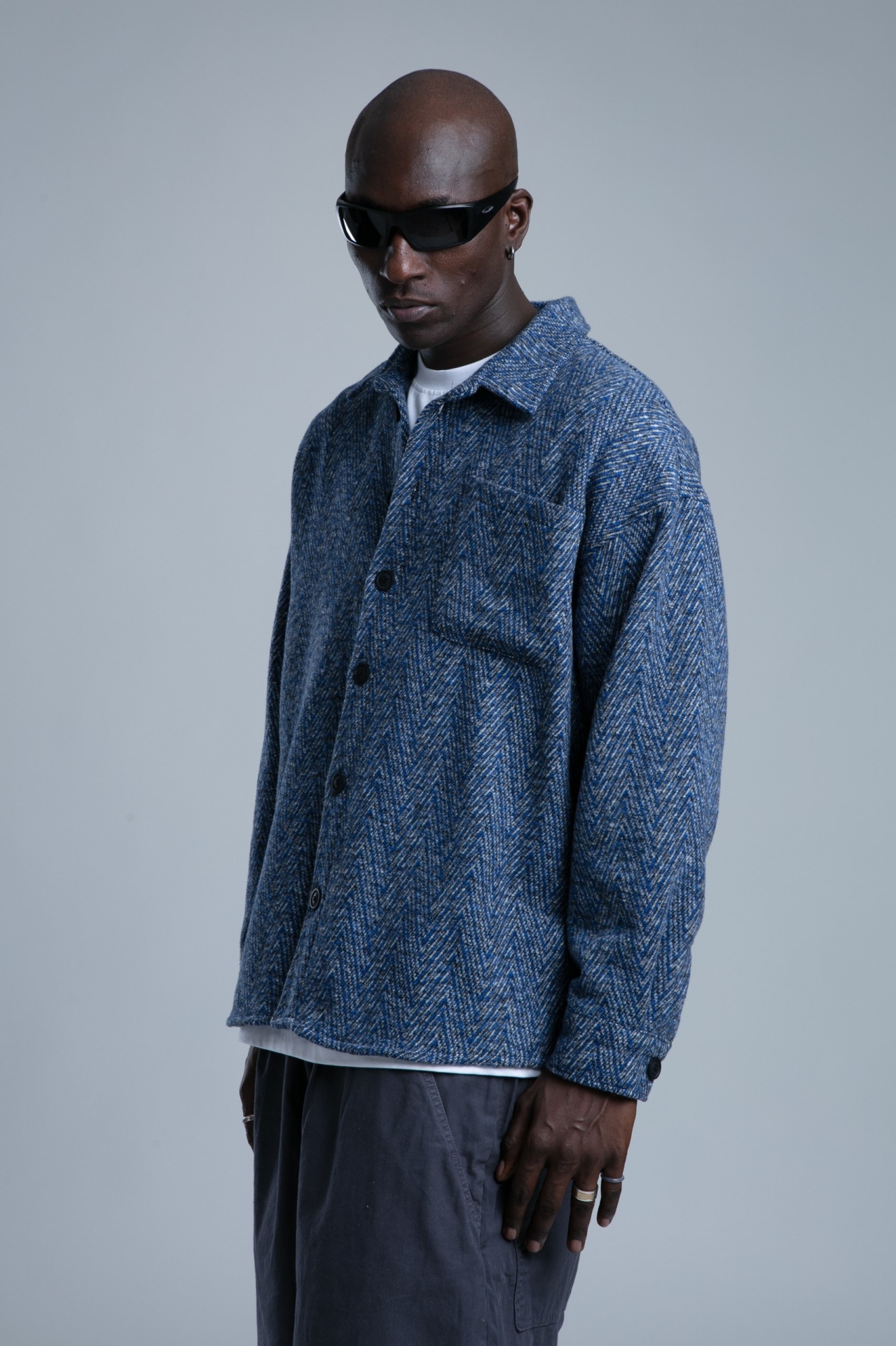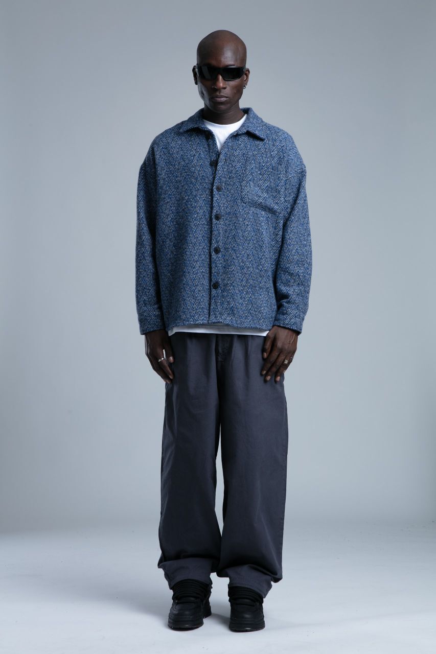 پیراهن مردانه پشمی با رنگ ابی صورمه ای مناسب برای ست کردن با شلوار جین میباشد.